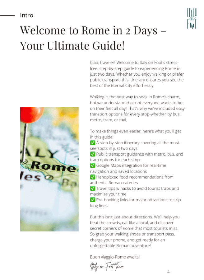 - You have 3+ full days and want slower pacing with more neighborhoods – the Three Days in Rome guide is built for that.