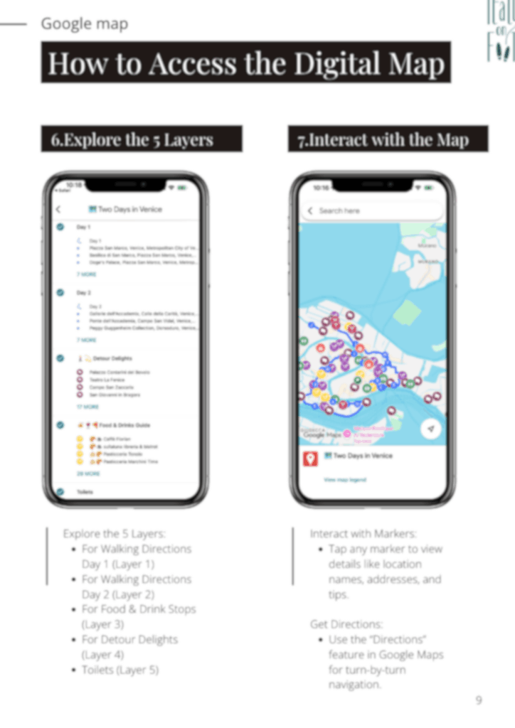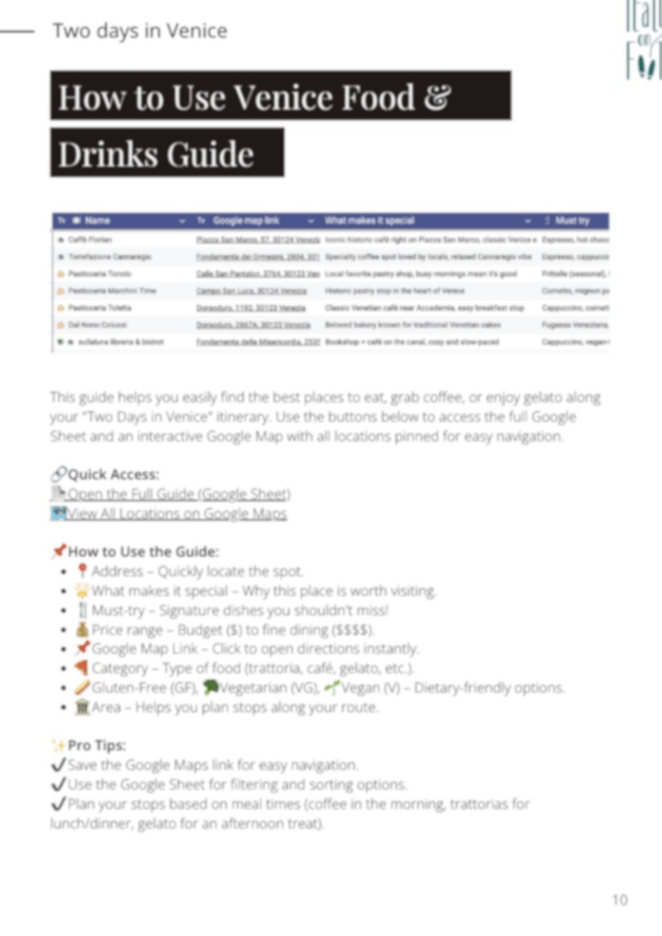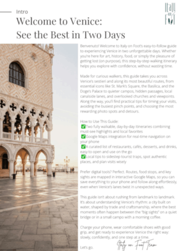 A 114-page step-by-step walking plan with layered Google Maps, a curated food and drinks guide, and all the Venice logistics sorted, so you can stop planning and start exploring.