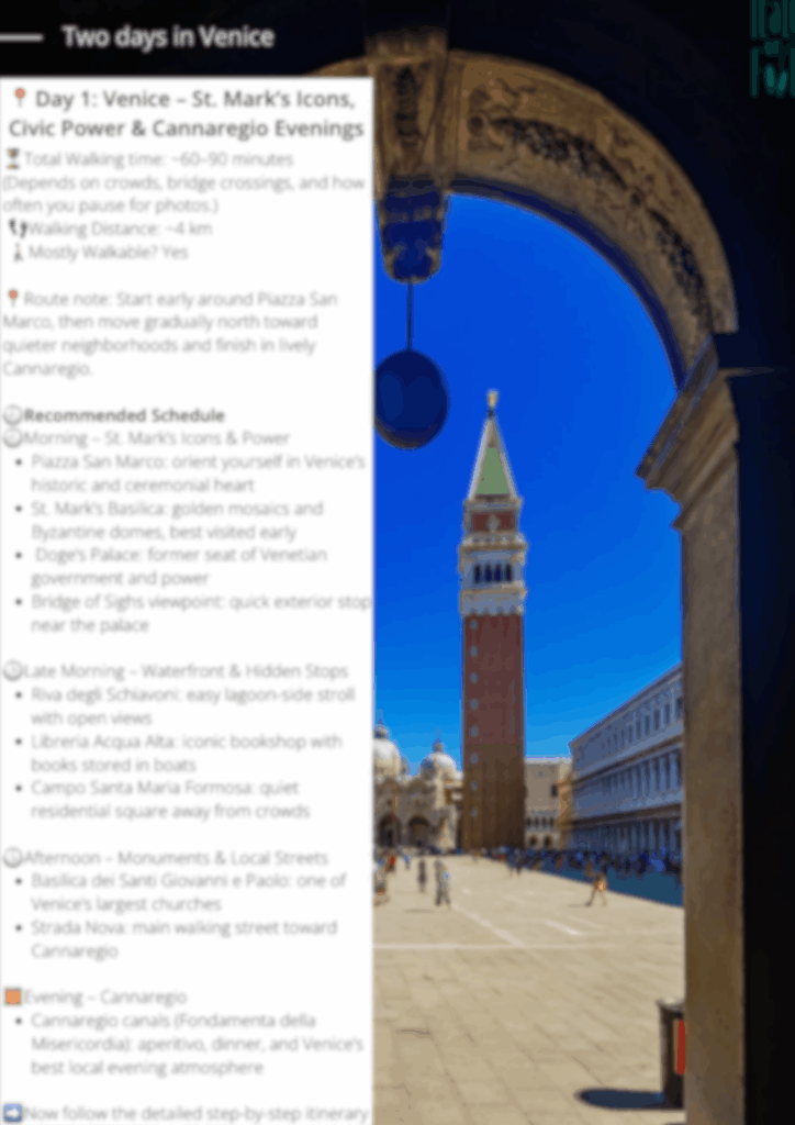 Yes. Day 1 starts with Venice’s headline sights early when it is calmer, then moves to quieter areas. It is designed to make Venice feel readable instead of overwhelming.